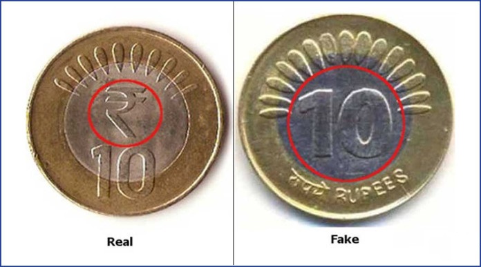 असली सिक्कों में 10 रूपए के साथ एक निशान बना होता है लेकिन नकली सिक्कों में यह निशान नहीं होता।