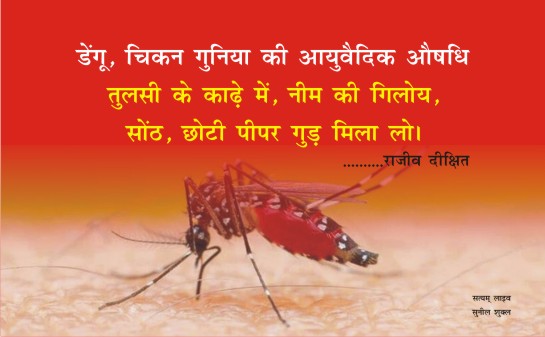 राजीव भाई ने जो औषधि का प्रयोग किया वो है …………….. तुलसी का काढ़ा बनाओ उसमें नीम की गिलोय, सोंठ, छोटी पीपर में थोड़ा गुड़ मिला लो बस इसी औषधि से डेंगू के लाखों व्यक्तियों को ठीक किया था। ये व्याख्यान आज भी नेट पर उपलब्ध है।