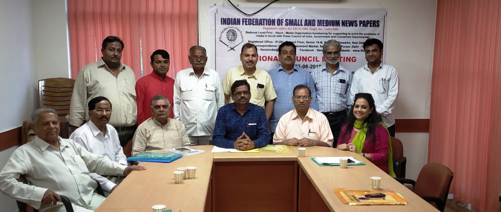 नई दिल्ली: दिनांक 3 अगस्त 2018, दिन शुक्रवार, समय 11 बजे सुबह “इंडियन फेडरेशन ऑफ स्माल एंड मध्यम न्यूजपेपर्स” (IFSMN) की नेशनल कौंसिल की मीटिंग स्थान एन डी तिवारी भवन, दीन दयाल उपाध्याय मार्ग दिल्ली में सम्पन्न हुई।