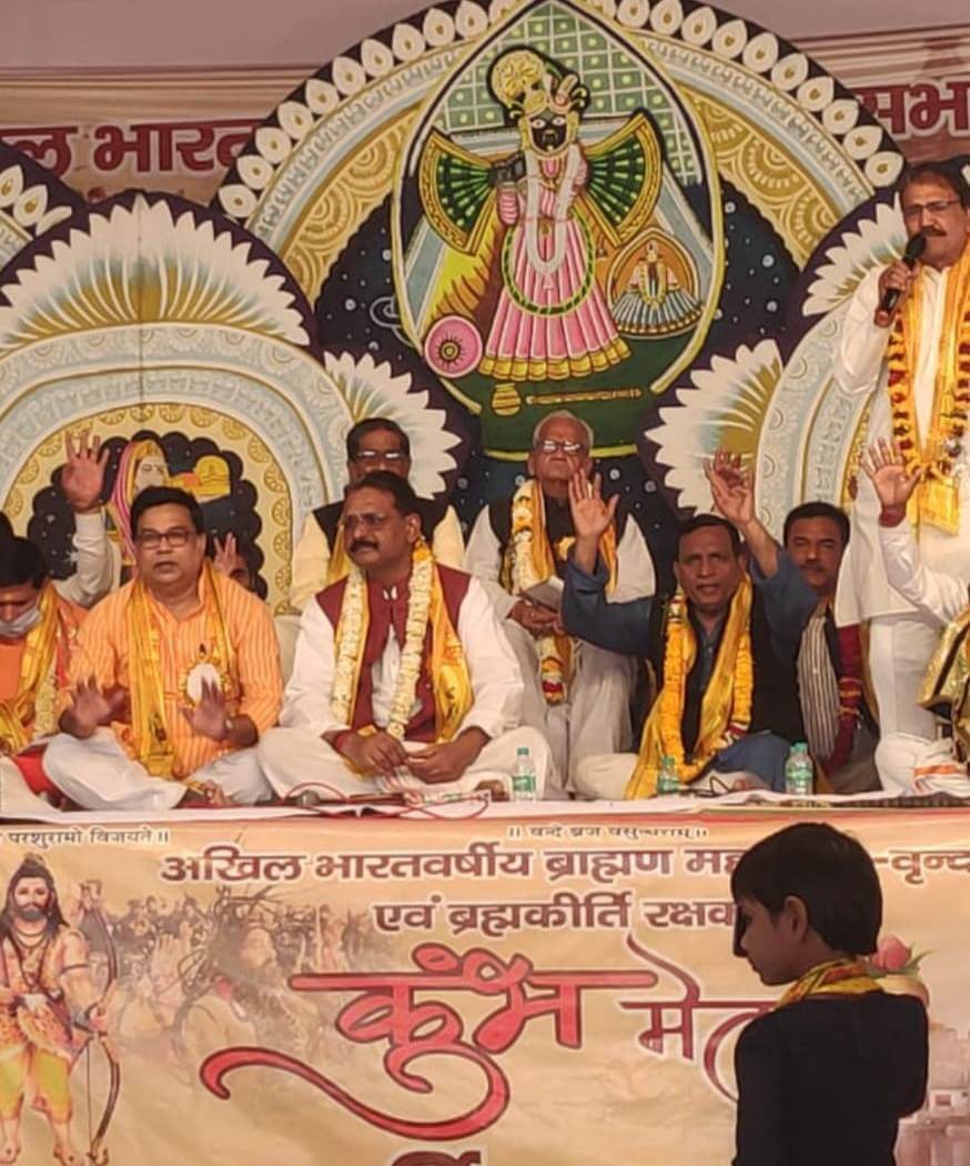 सत्यम् लाइव, 7 मार्च, 2021, वृंदावन: दिनांक 7 मार्च को वृंदावन कुंभ मेले में आयोजित शिविर में अखिल भारतवर्षीय ब्राह्मण महासभा का राष्ट्रीय अधिवेशन संपन्न हुआ। सभा में संपूर्ण देश से प्रतिनिधियों ने हिस्सा लिया। 22 राज्यों के प्रतिनिधि उपस्थित हुए और सम्मेलन में कई प्रस्ताव पारित किए गए। इस अवसर पर उत्तर प्रदेश के ज्यादातर जिलों के प्रतिनिधि उपस्थित रहे जिसका नेतृत्व प्रदेश अध्यक्ष के रूप में पंडित पीतांबर शर्मा ने किया। सभी को ब्राह्मण सभा के कार्यों तथा संगठन को कैसे मजबूत किया जाए, ब्राह्मण समाज की कैसे मदद की जाए, कैसे रचनात्मक काम किए जाएं आदि विषयों पर अपने अपने संबोधन में सब ने ब्राह्मण वर्ग को मजबूत करने पर बल दिया।