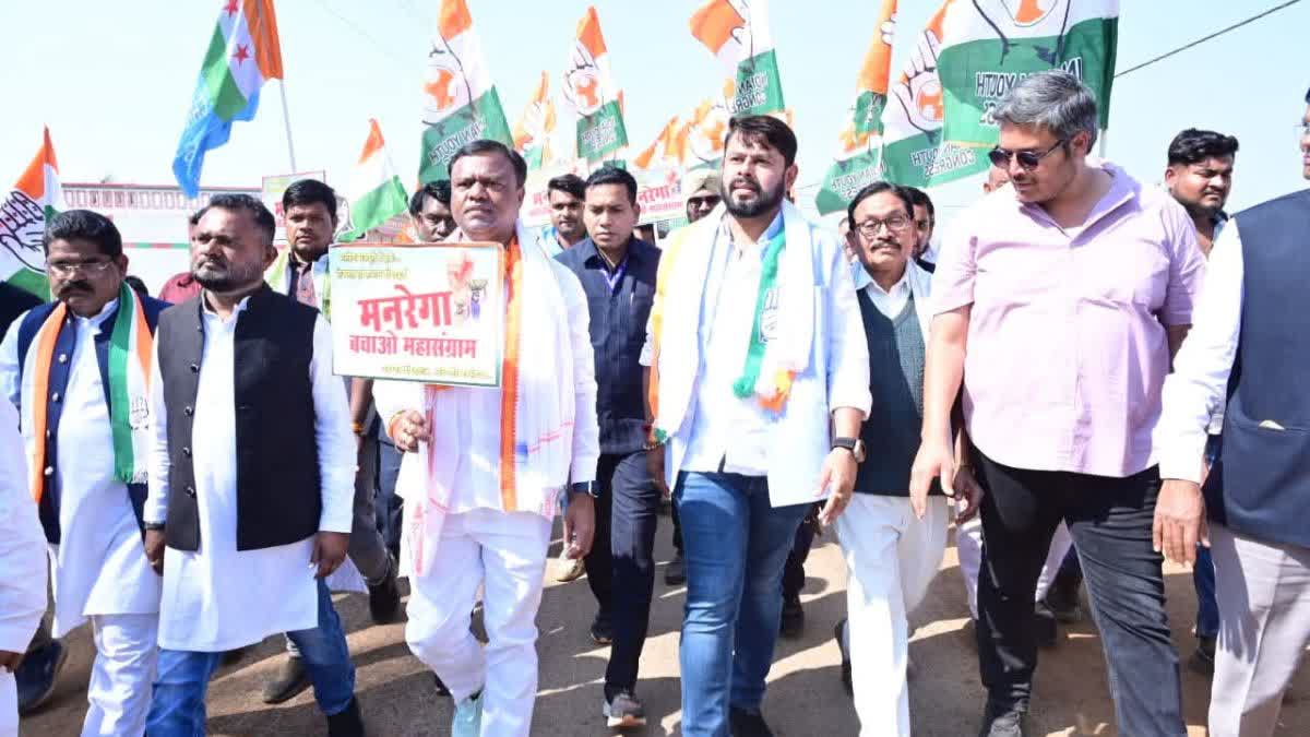 बेमेतरा: मनरेगा का नाम बदलकर विकसित भारत जी राम जी योजना कर दिया गया है. इसके साथ ही मनरेगा के प्रावधानों में कई तरह के बदलाव किए गए हैं. कांग्रेस पार्टी मोदी सरकार के इस फैसले का पूरे देश में विरोध कर रही है. छत्तीसगढ़ में पीसीसी चीफ दीपक बैज मोदी सरकार के इस निर्णय के खिलाफ पदयात्रा कर रहे हैं. वे मनरेगा बचाओ महासंग्राम के जरिए पदयात्रा के माध्यम से लोगों को जागरुक करने में जुटे हुए हैं.